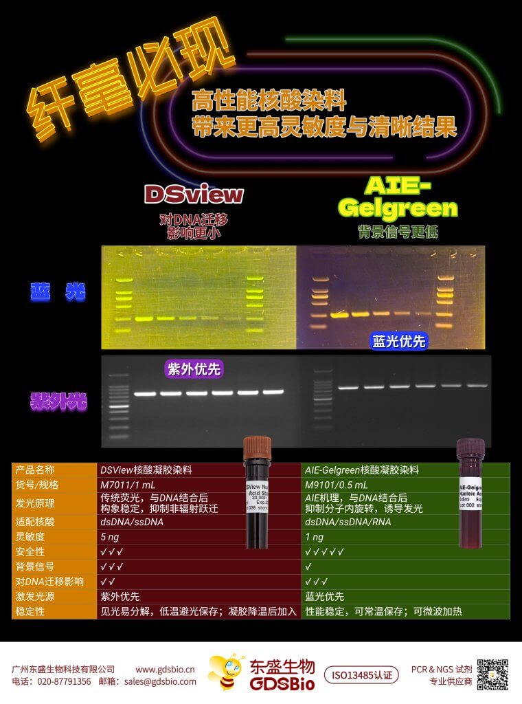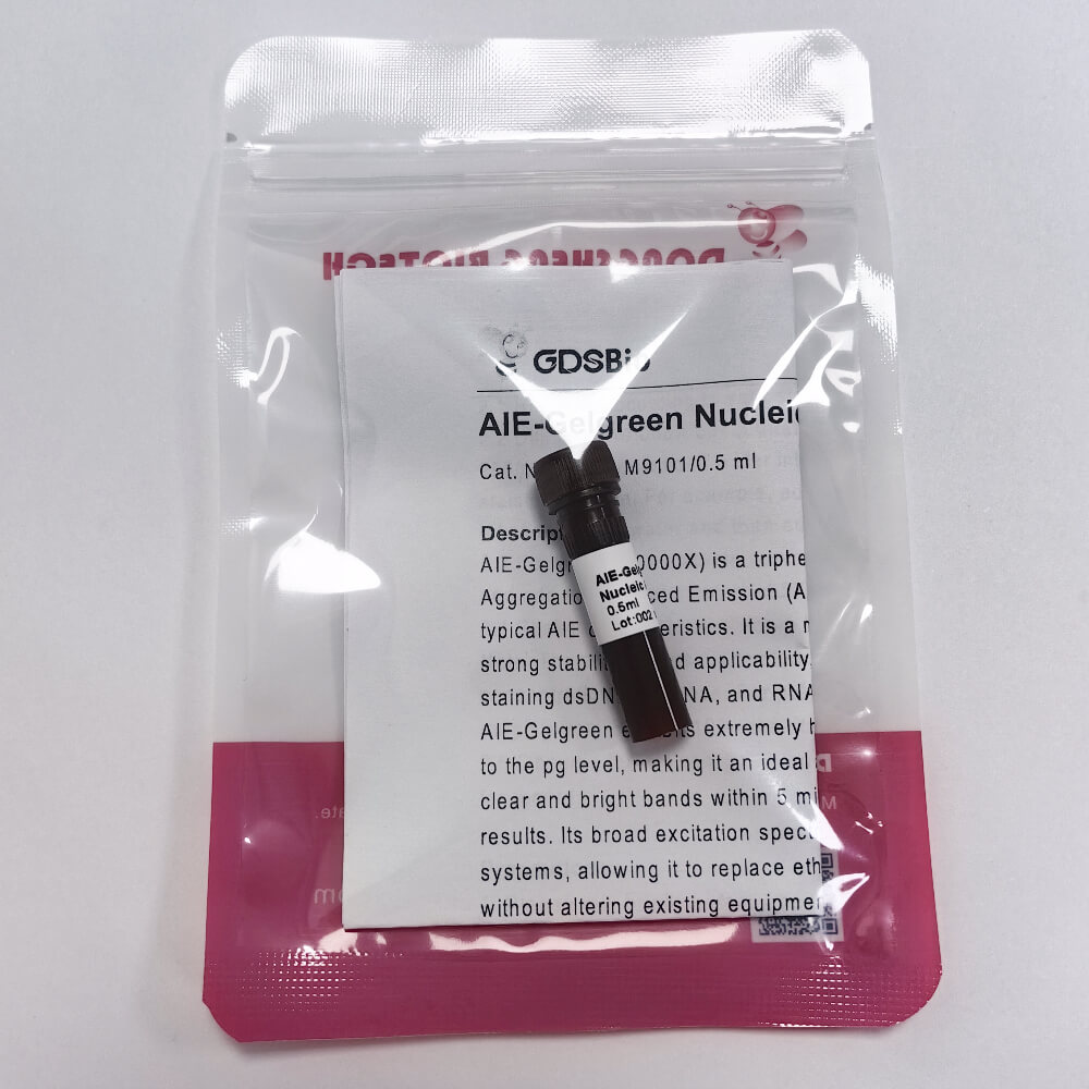 AIE-Gelgreen (10000X) 是一種基于(yu)聚集誘導發光(guang)(Aggregation-Induced Emission,AIE)熒光(guang)材料(liao)的(de)(de)(de)三苯胺衍生物,具(ju)有典型的(de)(de)(de) AIE 特(te)(te)性。它是一種靈敏度(du)高、穩(wen)定性強、適(shi)(shi)用(yong)性廣且兼容性極(ji)佳(jia)的(de)(de)(de)核(he)酸(suan)凝膠(jiao)染(ran)(ran)(ran)料(liao),可(ke)(ke)(ke)用(yong)于(yu)瓊脂(zhi)糖(tang)凝膠(jiao)和(he)聚丙烯酰胺凝膠(jiao)中的(de)(de)(de) dsDNA、ssDNA 以(yi)及(ji) RNA 的(de)(de)(de)染(ran)(ran)(ran)色。AIE-Gelgreen 表現出極(ji)高的(de)(de)(de)靈敏度(du),檢(jian)測(ce)限低至1 ng,是銀染(ran)(ran)(ran)的(de)(de)(de)理想替代品,能在 5 分鐘內獲得清晰(xi)明(ming)亮的(de)(de)(de)條帶,操作簡單(dan),結果直觀。其具(ju)有較寬(kuan)的(de)(de)(de)激發光(guang)譜特(te)(te)性,可(ke)(ke)(ke)兼容多種成(cheng)像(xiang)系(xi)統,無需改變(bian)現有設(she)備即可(ke)(ke)(ke)替換(huan)溴化乙(yi)錠(ding)(EB)和(he)其他凝膠(jiao)染(ran)(ran)(ran)料(liao),適(shi)(shi)用(yong)于(yu)原先使用(yong) SYBR Green 或 SYBR Gold 等核(he)酸(suan)染(ran)(ran)(ran)料(liao)的(de)(de)(de)凝膠(jiao)成(cheng)像(xiang)和(he)檢(jian)測(ce)系(xi)統。此外,AIE-Gelgreen 可(ke)(ke)(ke)使用(yong)對人(ren)體(ti)無害的(de)(de)(de)藍光(guang)燈或藍光(guang)成(cheng)像(xiang)儀(yi)進行核(he)酸(suan)檢(jian)測(ce),避免(mian)了常規紫(zi)外檢(jian)測(ce)對核(he)酸(suan)樣品的(de)(de)(de)致突(tu)變(bian)性以(yi)及(ji)對人(ren)眼和(he)皮膚的(de)(de)(de)傷害,是與(yu)激光(guang)掃(sao)描儀(yi)配合使用(yong)的(de)(de)(de)理想選擇。
