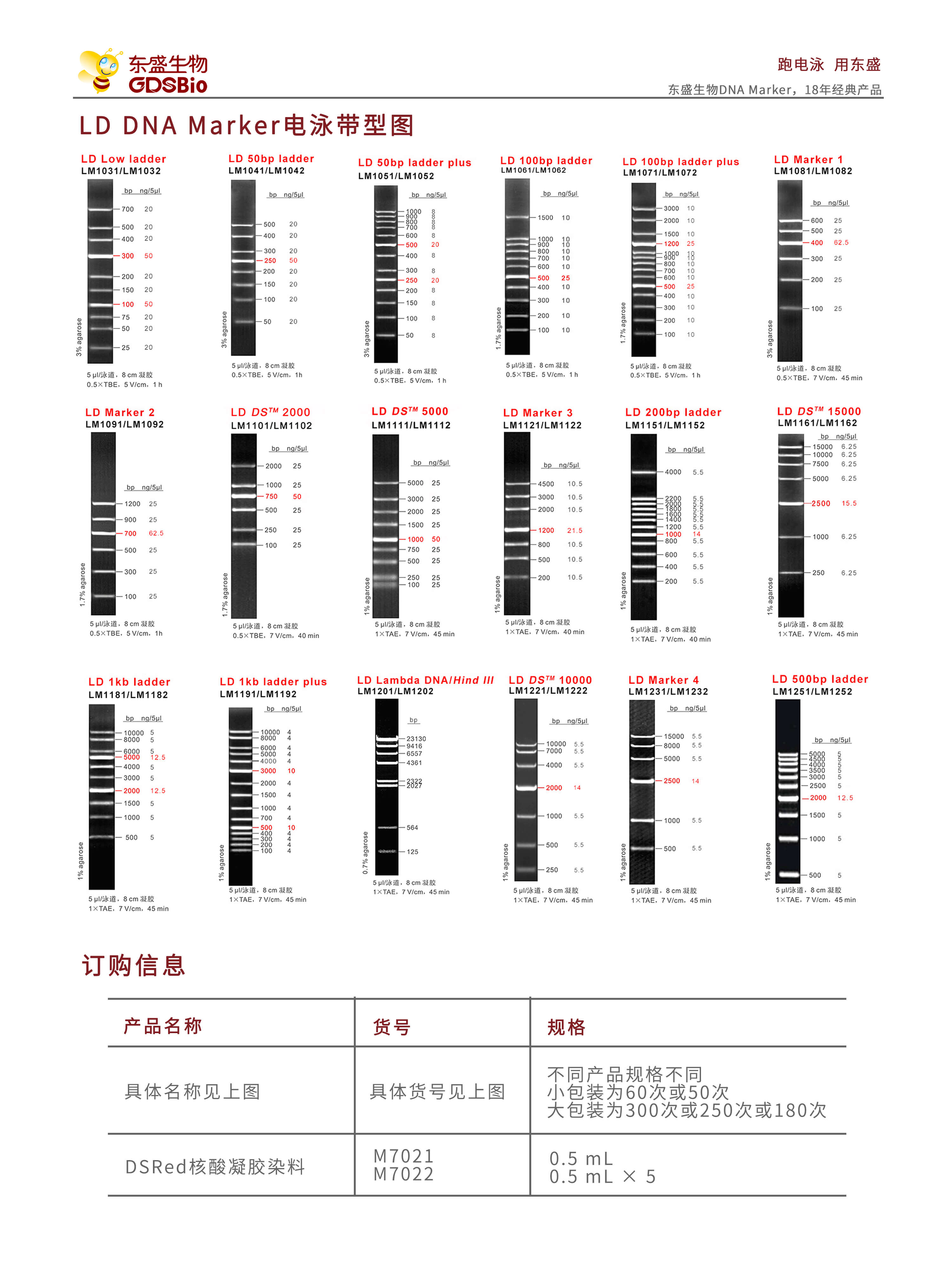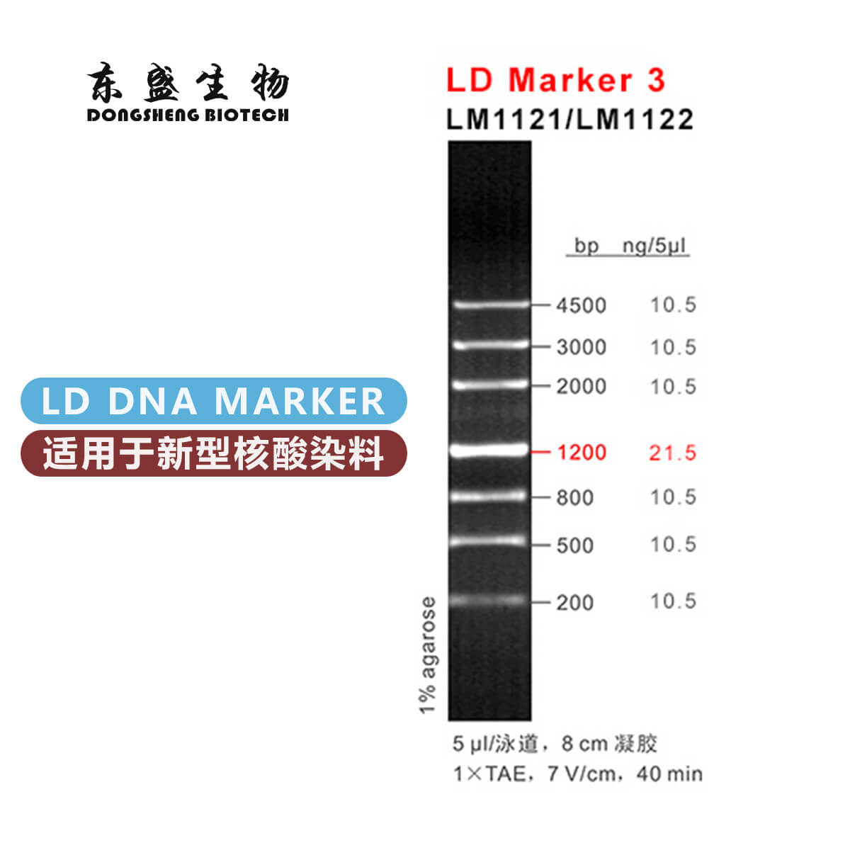 LD Marker 3是由7條雙鏈線狀DNA片段混合而成的DNA分子量標準(DNA Marker/ DNA Ladder),適用于確定200?bp至4.5?kb的線性雙鏈DNA片段大小,指示帶為1200 bp,便于電泳后觀察。每條帶都通過嚴格的物理定量,可用于測定目的片段的大小和含量。本品為東盛生物LD系列DNA Marker,適用于新型核酸染料(如東盛DSRed等)預染法瓊脂糖凝膠電泳。