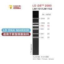 LD DS?2000是由6條雙鏈線狀DNA片段混合而成的DNA分子量標準(DNA Marker/ DNA Ladder),適用于確定100 bp至2 kb的線性雙鏈DNA片段大小,指示帶為750 bp,便于電泳后觀察。每條帶都通過嚴格的物理定量,可用于測定目的片段的大小和含量。本品為東盛生物LD系列DNA Marker,適用于新型核酸染料(如東盛DSRed等)預染法瓊脂糖凝膠電泳。